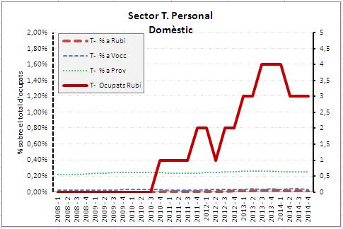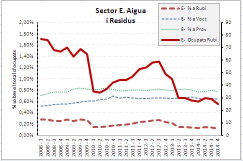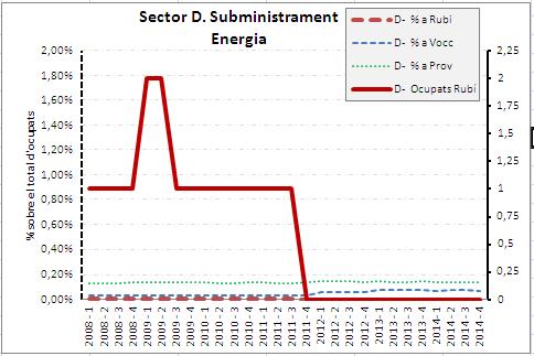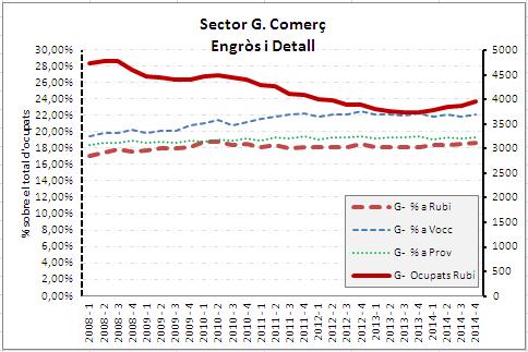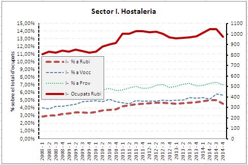 Lectura dels gràfics. L'eix dret representa el nombre de treballadors a Rubí, que és on projecta la la línia contínua de color vermell (entenent treballadors com el conjunt dels ocupats a Rubí: assalariats+ autònoms). L'eix esquerra es el % dels ocupats a aquell sector sobre el total d'ocupats al mercat de treball en cadascun dels tres àmbits territorials comparats: Rubí, Vallès Occidental i Província. Són les línies discontínues de color vermell (Rubí), blau (Vallès Occidental) i verd (Província de Barcelona).