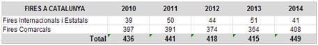 Tot i la petita davallada del 2012 el nombre de fires ha anat creixent cada any. L’any passat, a Catalunya es van celebrar 415 activitats firals d’àmbit català local i/o comarcal, internacional i estatal en elsmunicipis catalans i si ho comparem amb les fires previstes l’any 2014, hi ha un increment del 8,2% de fires, aquest increment avala la importància de les fires com a dinamitzador econòmic local, tot i que hi ha fluctuacions pels que fa a les fires internacionals-estatals segons les celebracions siguin en anys parells i senars.