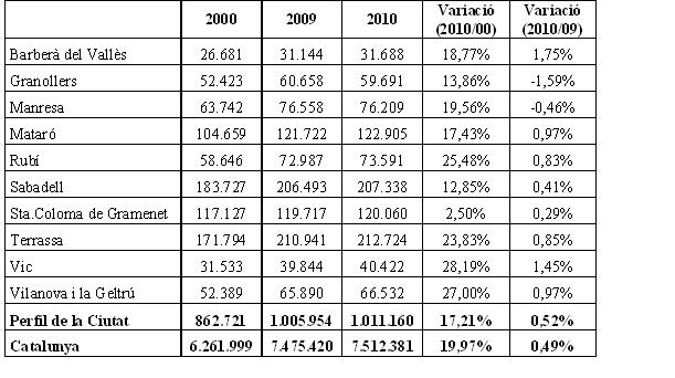 Per altra banda si ens fixem amb l’evolució de la població per cada un dels anys de la darrera dècada (veure-la les dades a l'informe de 2010 del perfil de la ciutat) . Gairebé tots els municipis presenten una tendència creixent de població amb l’excepció de Sta. Coloma que presenta oscil·lacions, i Granollers i Manresa que aquest darrer any presenta un creixement negatiu, caldrà observar si aquest és un canvi puntual o estem davant un canvi de tendència en aquests municipi i en la resta de municipis del perfil.