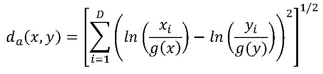 [2]La fórmula de la distància d’Aitchison és distancia aitchisonon g(x) i g(y) són la mitjana geomètrica —no la mitjana aritmètica— de la dada composicional de x i de y, respectivament.