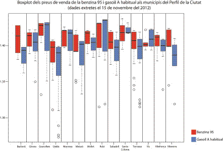 Però no hi ha res millor que un mateix utilitzi les dades. Així amb dades extretes ahir dijous 15 de novembre, corresponents a la benzina 95 i de gasoil, per als catorze municipis que configuren el Perfil de la Ciutat s’obté el següent boxplot.