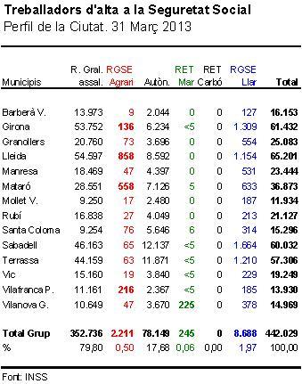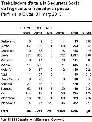 Fent una anàlisi de les dades dels diferents règims de la Seguretat Social per als municipis del Perfil de la Ciutat, s’observa que, per a alguns, les xifres registrades per al sector primari poden arribar a ser força considerables, com ho són tradicionalment per a Lleida o per a Vilafranca del Penedès (on el pes de l’agricultura en l’estructura econòmica és especialment rellevant), però també ho és per a una ciutat eminentment industrial com Mataró, per a la qual el pes del sector primari és superior a l’1,75%, relacionant-hi 645 treballadors, dels quals 558 del règim especial agrari i 5 del pesquer no es consideraven en els còmputs habituals. Una cosa similar esdevé per a Vilanova i la Geltrú en relació als treballadors del mar de règim especial, que s’eleven a 225, fent que el seu sector primari, en realitat, superi el 2% del total de l’estructura.