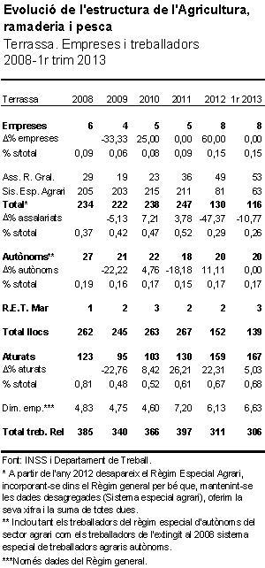 Les sèries temporals per a cadascun dels municipis ens mostren una evolució desigual, segurament associada amb la intensitat del procés d’expansió urbanitzadora i també a la professionalització dels negocis del sector. A partir de 2012 desapareix el règim especial agrari i els treballadors passen a cotitzar com a règim general, si bé diferenciats en el denominat règim general sistema especial”, que ha de tendir a fondre’s amb l’altre. L’efecte d’aquesta migració de règims està suposant, de fet, la desaparició de llocs de treball en el còmput total del règim general, com així ocorre per als municipis de marcat caràcter industrial, quan inicialment els augments experimentats en el total dels assalariats de règim general normal podien fer pensar en una tendència a l’alça (vegeu la taula emprada per al seguiment de les dades de Terrassa).