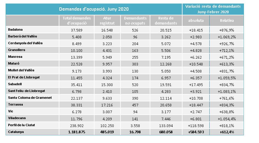 A tots els municipis de la xarxa Perfil de la Ciutat el nombre de demandants d’ocupació registren increments força elevats entre els mesos de febrer i juny de 2020, però és en el grup de la resta de demandants, és a dir, aquell que inclou les persones treballadores afectades per un expedient de regulació temporal, on es concentra els increments més elevats i, en tots els casos, per sobre del registrat al conjunt de Catalunya.