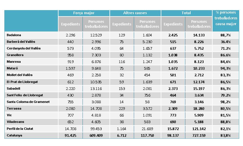 A data 1 de juliol els treballadors afectats per ERTO a Catalunya són 727.159, dels quals el 83,8% s’inclouen en un expedient per causa de força major. El nombre de treballadors afectats per ERTO al conjunt del Perfil de la Ciutat és de 121.142, xifra que representa el 16,7% del total de treballadors afectats a Catalunya.