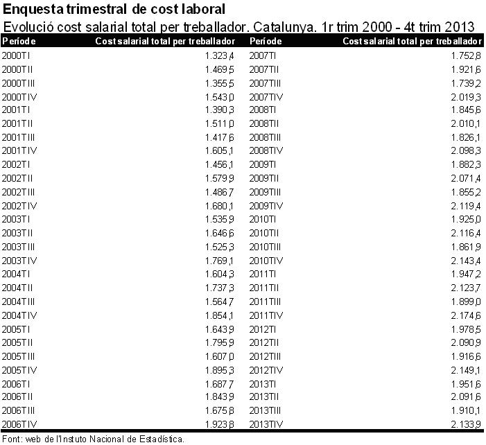 Per començar, ens fixarem amb les dades de l'Enquesta trimestral de cost laboral (ETCL). Aquesta és una operació estadística contínua de caràcter trimestral realitzada per l'INE que permet conèixer el cost salarial i el cost total per treballador (entre altres indicadors). Observem les dades del cost salarial per treballador a Catalunya des de l’any 2000 fins el darrer trimestre de 2013: