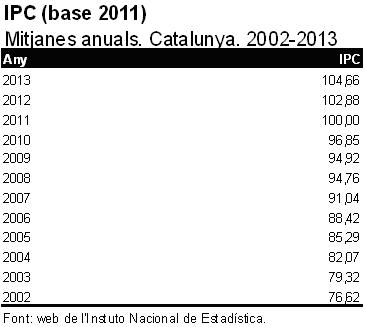 La següent taula mostra l’evolució de l’IPC (base 2011) de Catalunya, des de l’any 2003 fins l’any 2013: