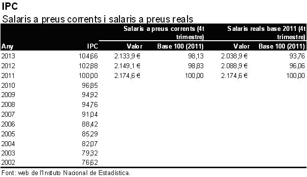 Amb aquestes dades podem veure com la mitjana anual dels preus ha augmentat un 4,66% respecte de l’any 2011. Per tant, en el període 2011-2013, tenim que els salaris han disminuït un 1,87% i els preus han augmentat un 4,66%. Amb aquests resultats ja podem intuir que el descens del nostre salari ha estat més intens del que realment ens pensàvem. Però quant? El que farem és deflactar el salari tenint en compte els preus, i el resultat que obtenim és el que es mostra tot seguit: